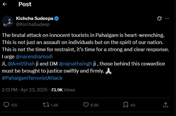 ಉಗ್ರರ ದಾಳಿಯ ಕುರಿತು ತಮ್ಮ ಸಾಮಾಜಿಕ ಜಾಲತಾಣ ಎಕ್ಸ್ನಲ್ಲಿ ಪ್ರತಿಕ್ರಿಯಿಸಿರುವ ನಟ ಕಿಚ್ಚ ಸುದೀಪ್ ಅವರು, ಈ ಹೇಯ ಕೃತ್ಯದಲ್ಲಿ ಭಾಗಿಯಾದವರನ್ನು ಶಿಕ್ಷಿಸುವಂತೆ ಪ್ರಧಾನಿ ನರೇಂದ್ರ ಮೋದಿ ಮತ್ತು ಗೃಹ ಸಚಿವ ಅಮಿತ್ ಶಾ ಅವರಿಗೆ ಮನವಿ ಮಾಡಿದ್ದಾರೆ.