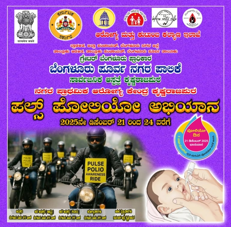 ಕೆ.ಆರ್.ಪುರ ಸರ್ಕಾರಿ ಆಸ್ಪತ್ರೆಯಲ್ಲಿ ಪಲ್ಸ್ ಪೋಲಿಯೋ ಲಸಿಕೆ ಅಭಿಯಾನದ ಬಗ್ಗೆ ಸಾರ್ವಜನಿಕರಿಗೆ ಅರಿವು ಮೂಡಿಸುವ ಸಲುವಾಗಿ ಬೈಕ್ ಜಾಥ ಹಮ್ಮಿಕೊಂಡಿದ್ದು ಬೆಂಗಳೂರು ಪೂರ್ವ ನಗರಪಾಲಿಕೆ ಅಪರ ಆಯುಕ್ತ ಲೋಖಂಡೆ ಸ್ನೇಹಲ್ ಅವರು ಅಭಿಯಾನಕ್ಕೆ ಚಾಲನೆ ನೀಡಿ ಮಾತನಾಡಿದರು.